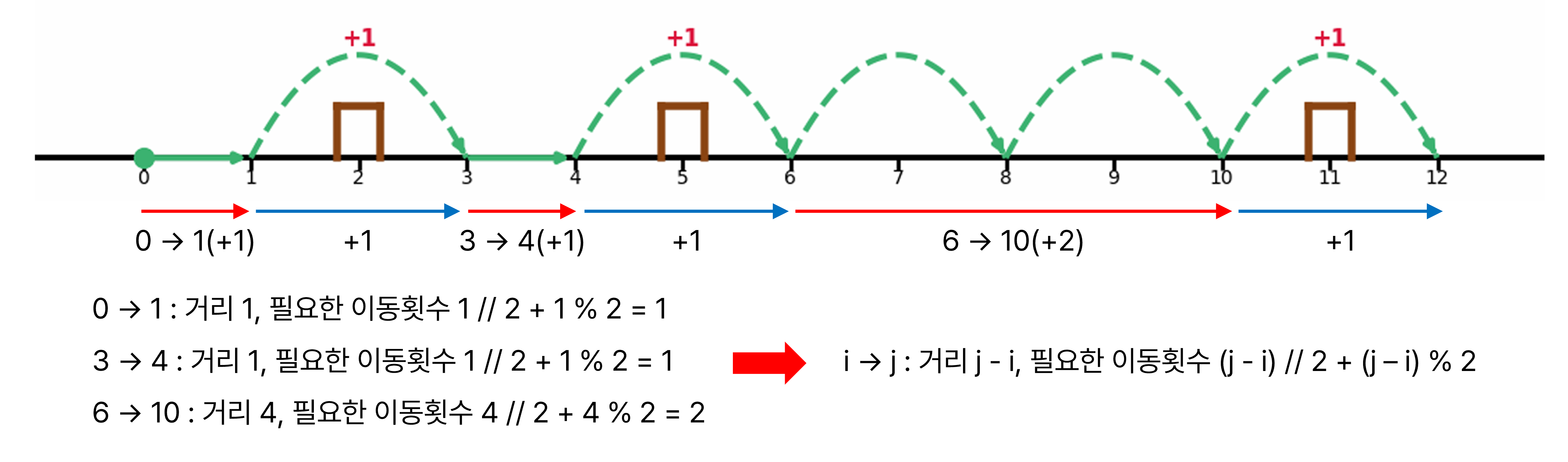 목적지(다음 장애물 앞 칸)까지 가장 적게 이동하려면 자연스럽게 1칸 걷기보다는 2칸 점프를 최대한 많이 활용해야 합니다.