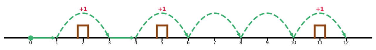 • 10 위치: 2칸 앞에 장애물이 없기 때문에 2칸 이동(10 → 12), 모든 장애물 극복 완료