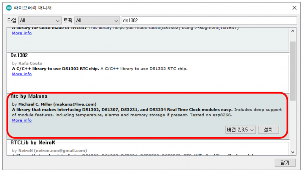 본문에서는 Rtc by Makuna 라이브러리를 사용합니다. 아두이노 라이브러리